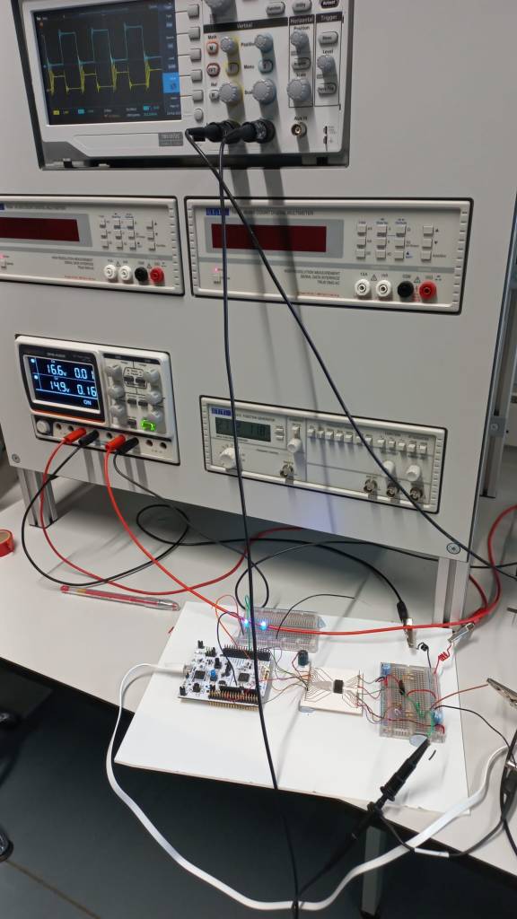 I wrote some code to generate a 130kHz PWM output signal and the driver PCB was hooked up to the power MOSFET. A long-distance shot of the system operating is show below. The blue trace on the oscilloscope is the gate drive signal while the yellow trace is the drain-source voltage. It has lots of overshoots and oscillations because of the poor layout and the inductance of the load resistor. Anyway, we are now happy that the STGAP2HD driver can actually drive our MOSFET. Next step: MUCH better layout and assemble/test one arm of an inverter bridge.