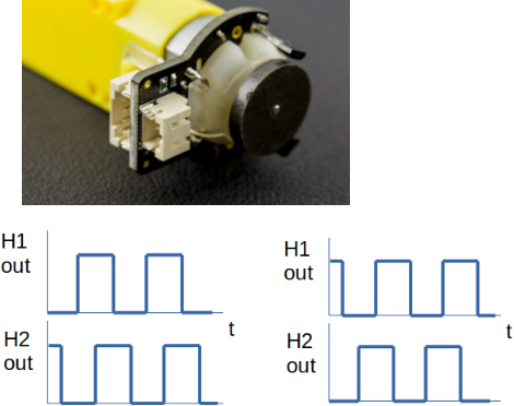 Quadrature encoders are used for measuring motor rotational speed and direction. They can be optical or magnetic just like the one below. This quadrature encoder has two Hall effect sensors which allow a program or quadrature encoder interface measure motor speed and direction.The figures above show the output from the two Hall effect sensors when the motor is running forwards and backwards. Notice how H1 has a falling edge when H2 is high on the left plot and it has a falling edge when H2 is high in the second plot. This allows a quadrature encoder interface to determine the motor direction.To measure motor speed, you need to measure pulse frequency and divide by the number of pulses produced during each cycle. The black disk in the photo above has a number of magnets embedded within it.The outputs from the Hall Effect sensors can be connected to the PhA and PhB inputs of the Tiva C on Port C (PC5,PC6).Code to initialize Quadrature Encoder Interface 1 on the Tiva C is shown below