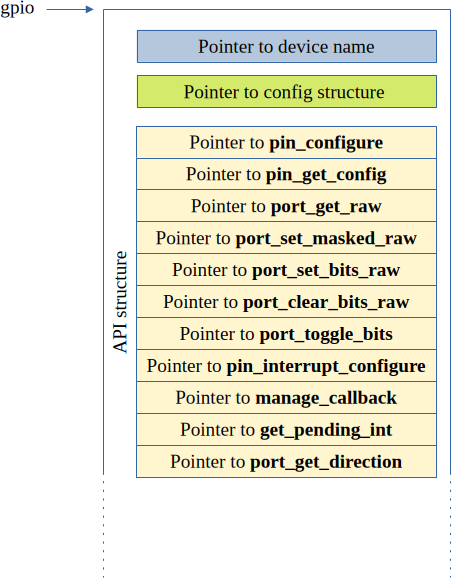 Of greatest significance for this article is the api member of this structure. This is a pointer to a structure that contains the functions we typically use to do GPIO. For GPIO devices this is defined as (gpio.h)