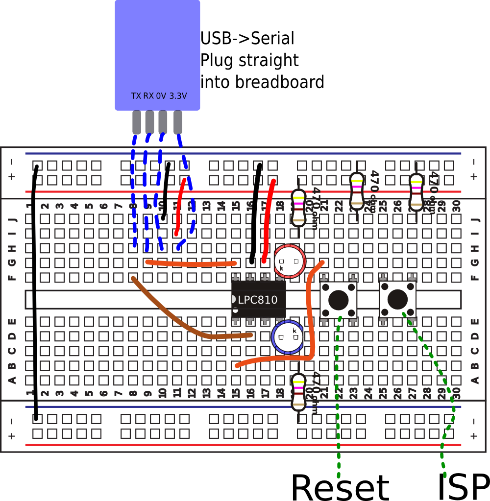 You don’t have to compile the game, a compiled version is provided in main.elf. You need a chip: the LPC810 – I got mine from Farnell at around 1 euro each) and a USB to serial converter. A breadboard (protoboard) is required along with a couple of resistors and buttons. (See circuit diagram). The next thing you need to do is to get the program on to the chip. I use lpc2isp for this. In order to compile the game you need a cross compiler for the ARM Cortex processor. You can get one for your platform here: https://launchpad.net/gcc-arm-embedded