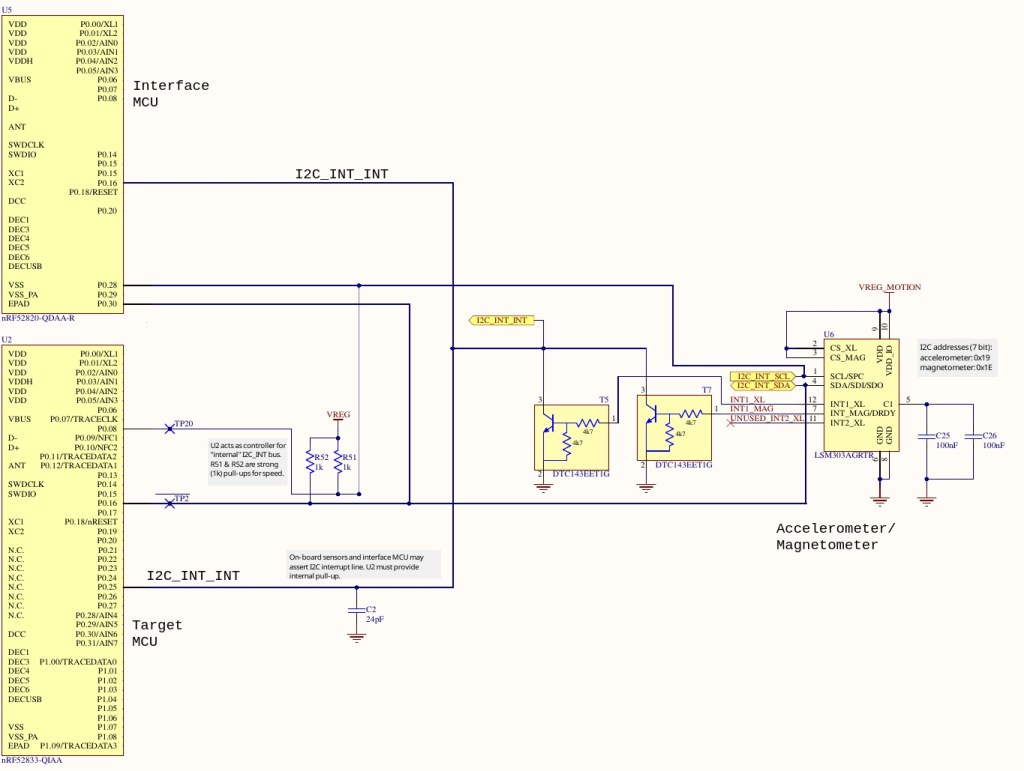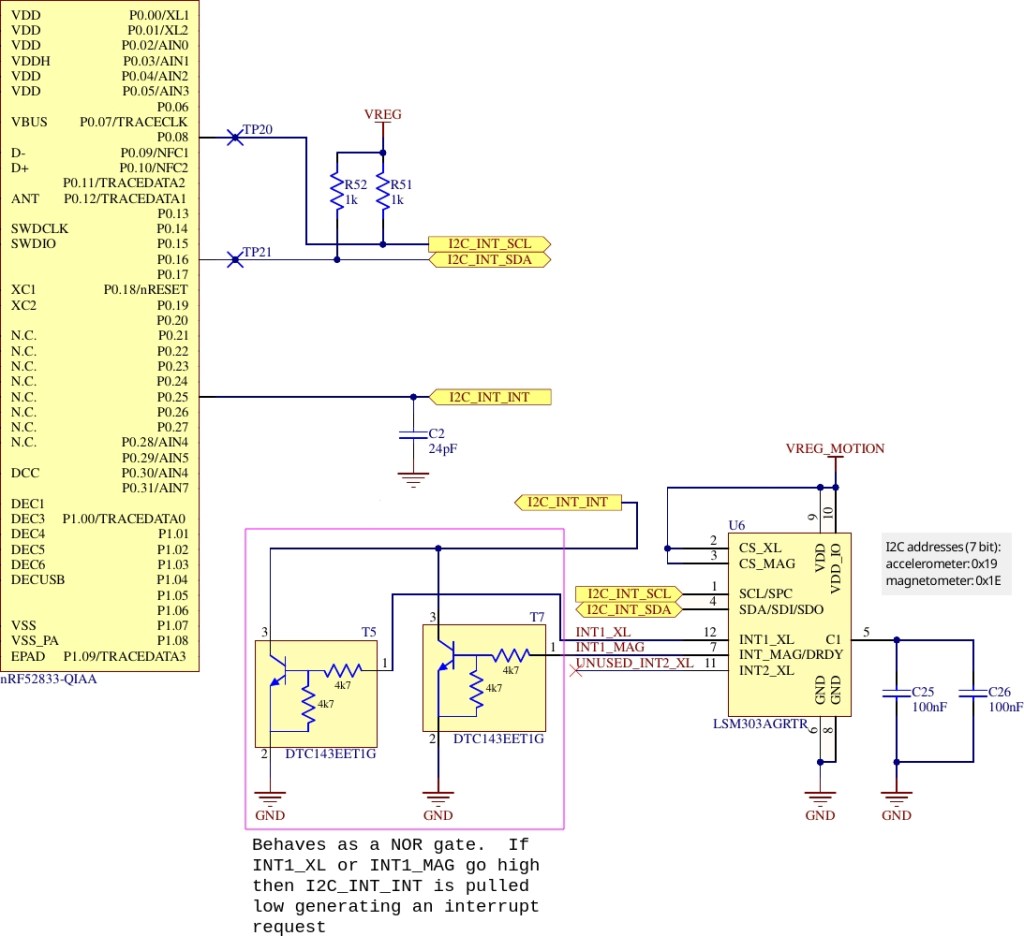 Our sample code programs the LSM303 as a step counter. When the accelerometer experiences low acceleration in all 3 axes (i.e. in freefall) it outputs an interrupt signal. This signal pulls the I2C_INT_INT line low (falling edge interrupt trigger). On Version 2.00 boards this worked fine, not so on V2.21 boards. The problem turned out to be that the interface MCU was holding the I2C_INT_INT line low permanently which prevented falling edge interrupts.