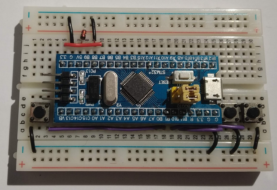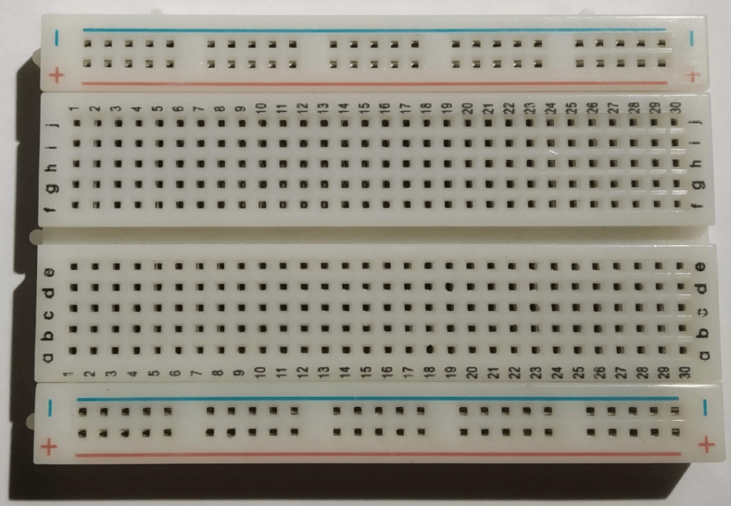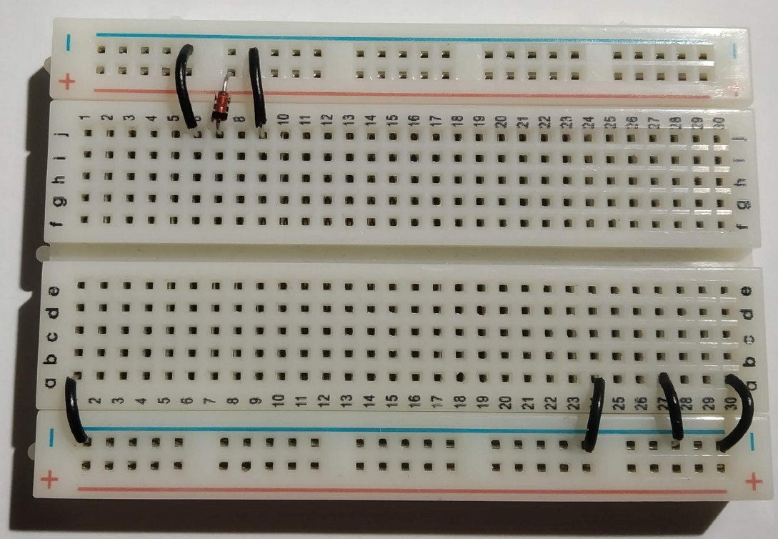 The microcontroller boards is placed as shown. It fits in to the left-most holes of the breadboard.