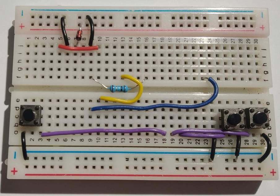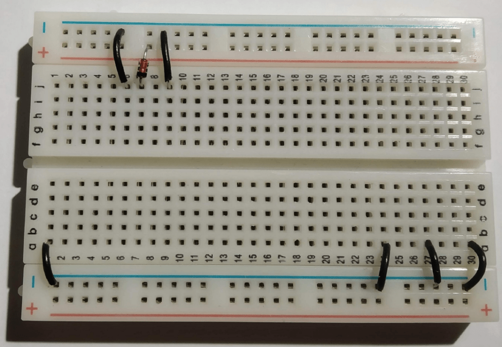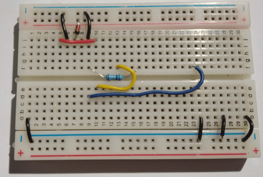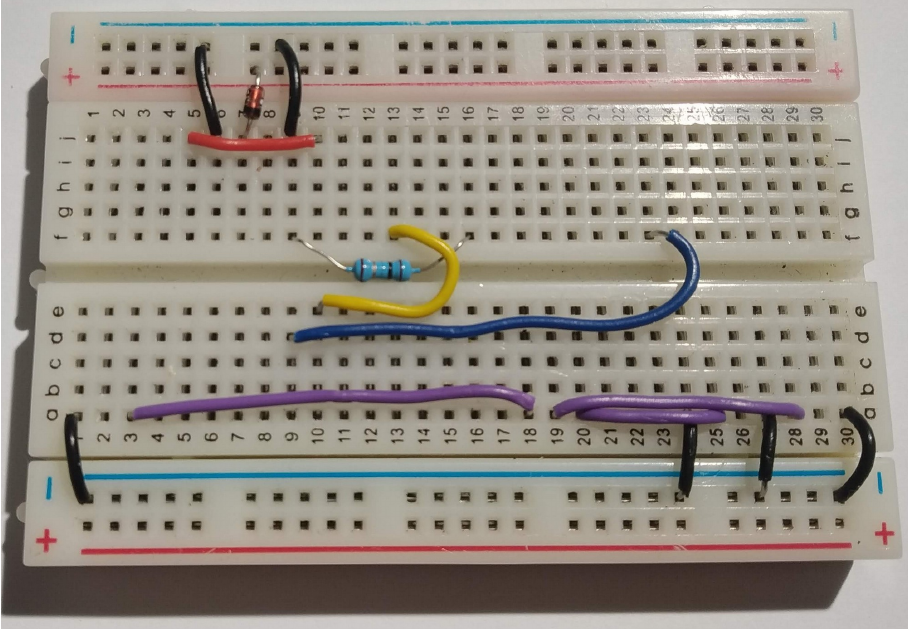 A set of construction images is shown below. Be careful to place the wires and components exactly as shown. The breadboard has rows labelled a to j and columents 1 to 63 which may help when inserting components. If you would like to know more about breadboards this video may help: