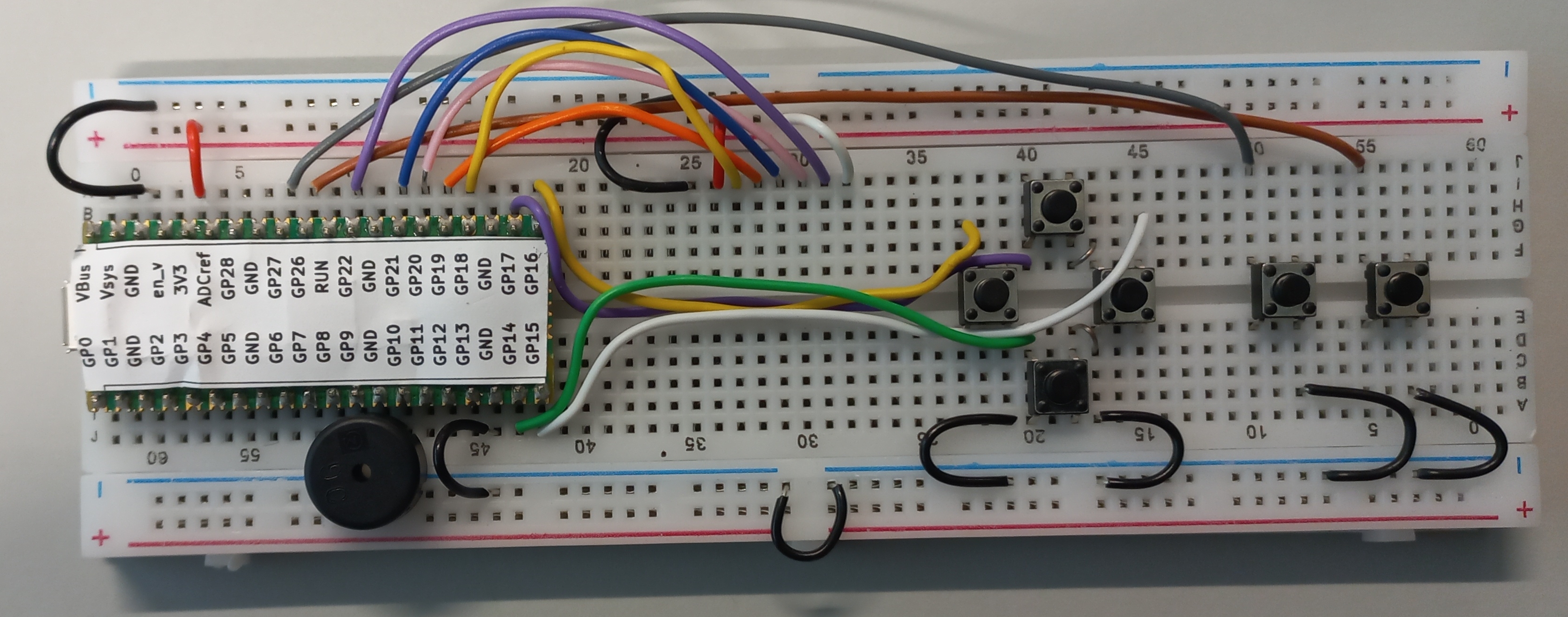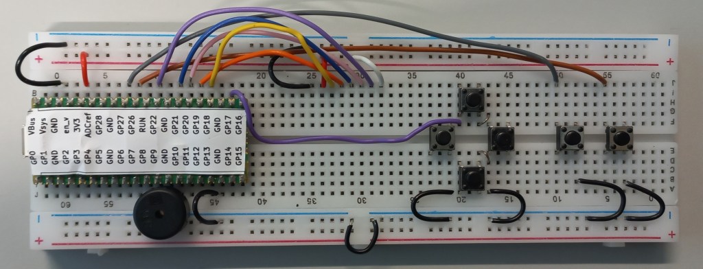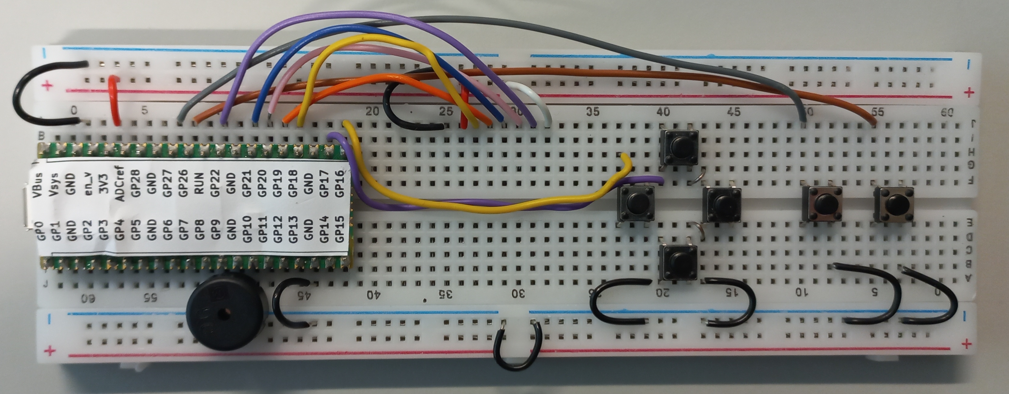 The buzzer placement is shown below. One pin goes into the ground track of the breadboard, the other wire goes to the leftmost column of the breadboard just below the microcontroller board.