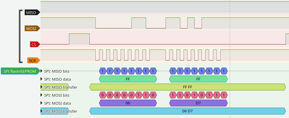 A high pulse can now be seen between the two SPI commands. As a final test, I replaced the fake “0xD7” command with “0xC7” and presto: erases now work.